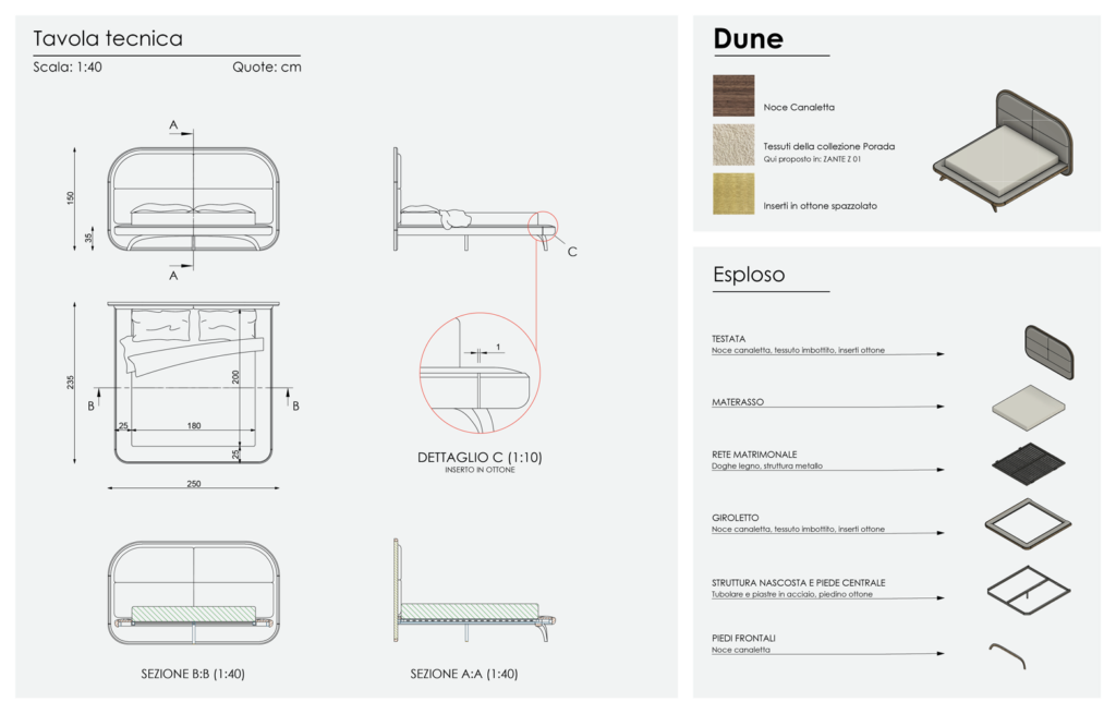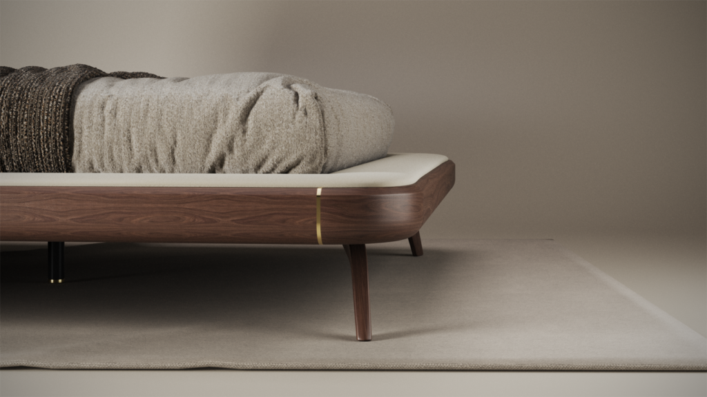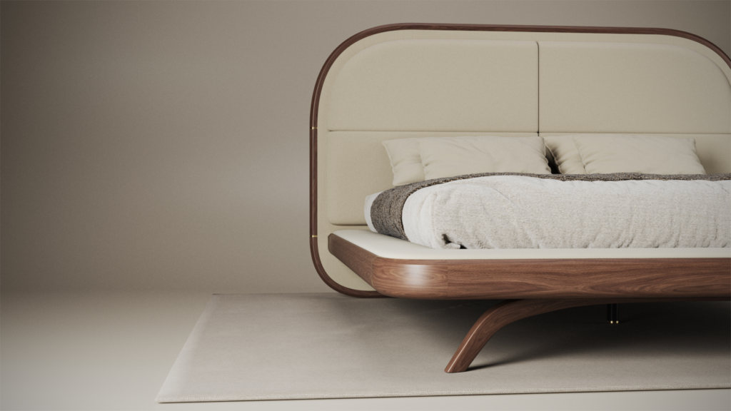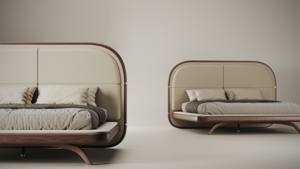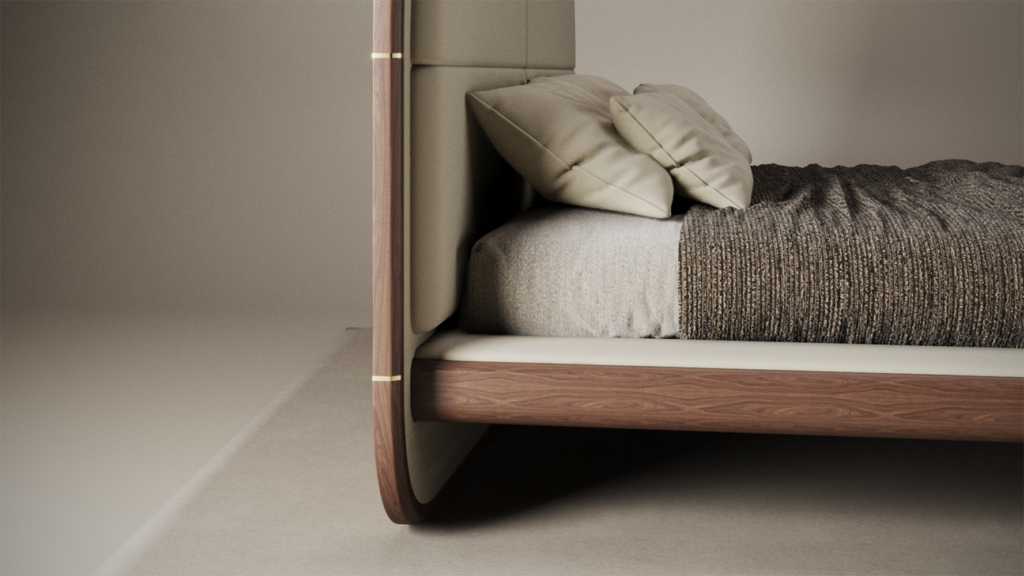 Dune is distinguished by a curved headboard upholstered in soft fabric, featuring four generously sized cushions arranged symmetrically and inspired by the gentle, flowing shapes of desert dunes. Another defining element is the upholstered bed frame which, in addition to creating a coherent and refined aesthetic, allows comfortable seating along its entire perimeter without disrupting the neatness of a freshly made bed. A design solution that combines elegance, comfort, and everyday practicality.
