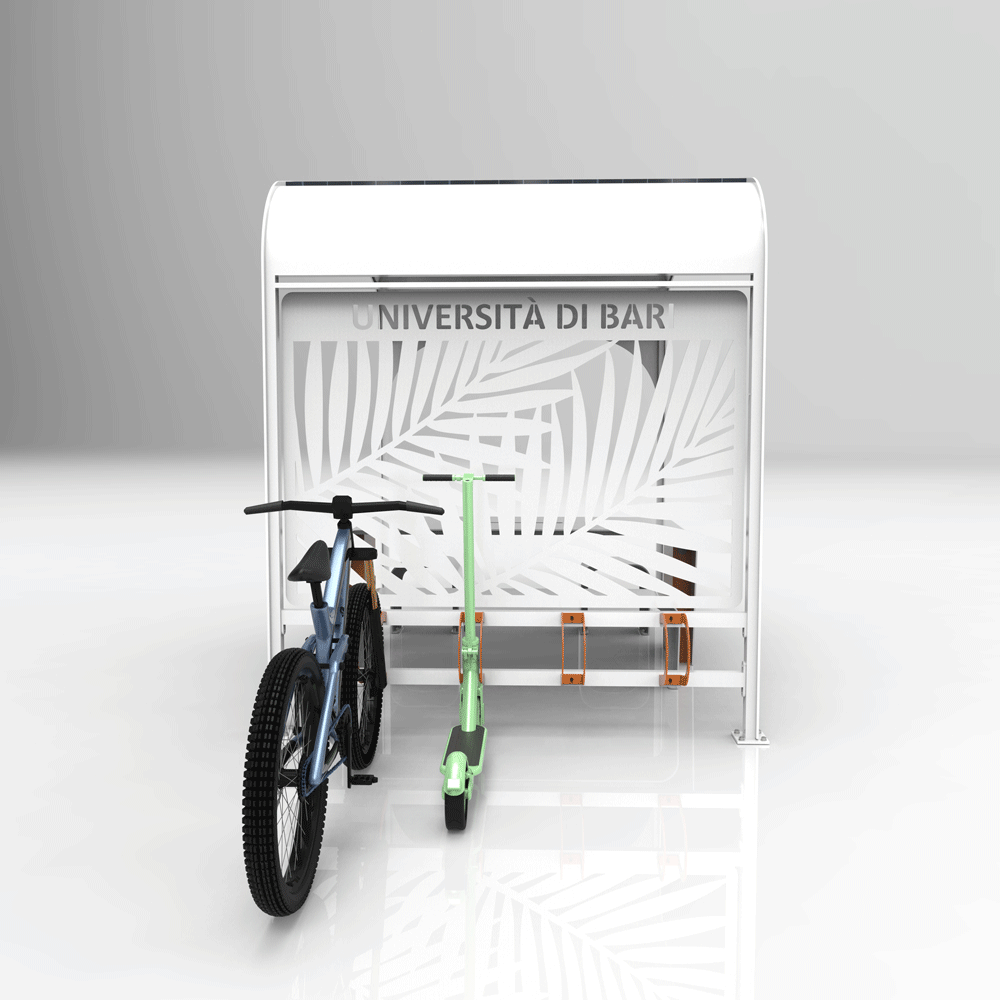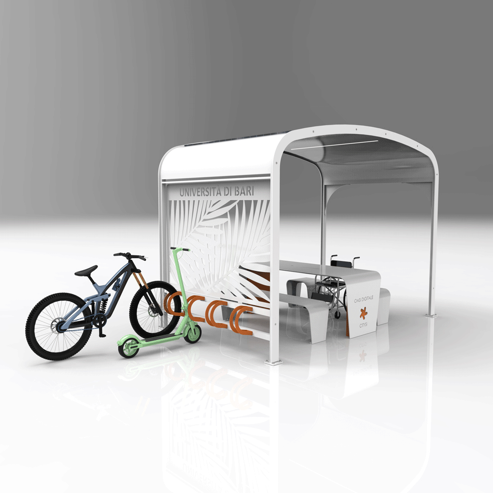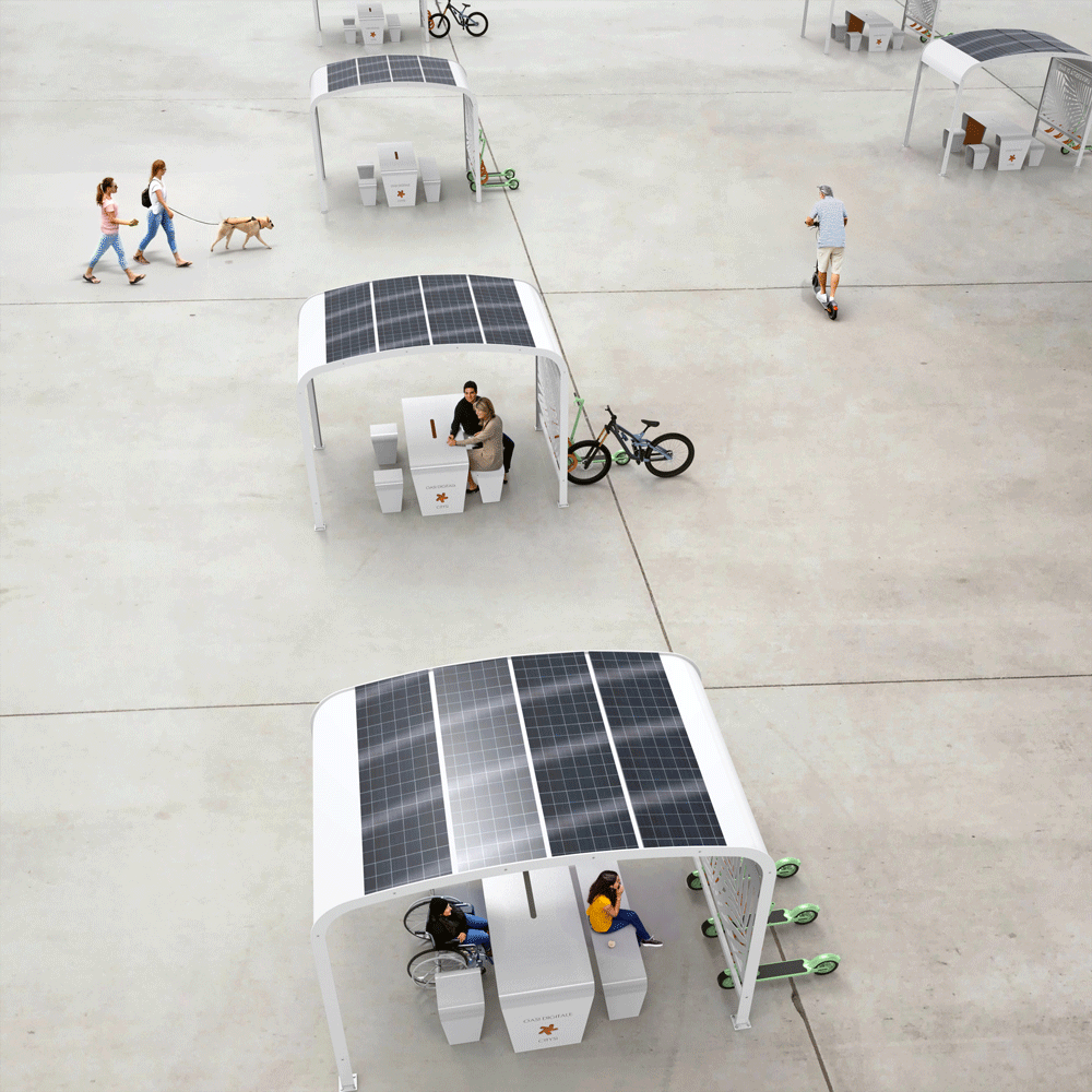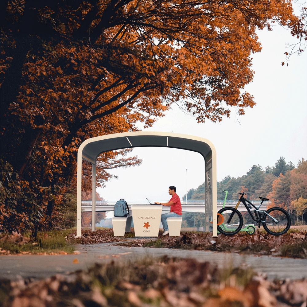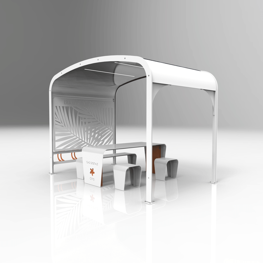 The project consists of a smart gazebo, self-powered by solar panels, which can accommodate up to six people. It provides them not only with a workstation but also with electricity to power their laptops.